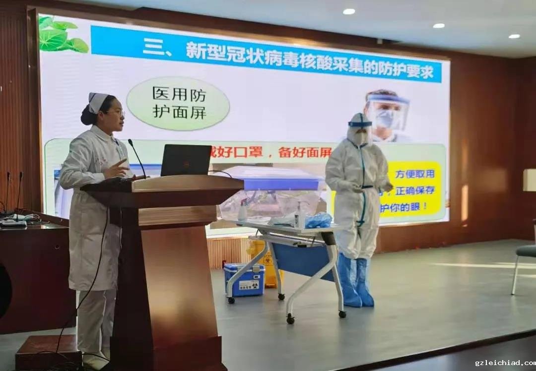 入院准备中心护士长张一平、感染管理科王敏对穿脱防护服以及鼻咽拭子的采集进行现场演示,详细讲解核酸采集人员设备、场地、防护、信息登记、标本转运、废物处理及“穿脱防护服”和“鼻咽拭子采集”的操作流程和注意事项。让参会人员更加熟练掌握核酸采集流程及要领,切身体验到核酸采集过程中患者感受及存在风险。