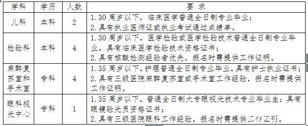 皖公网安备 34122202000155号 技术支持:太和万联网络 根据2021年招聘计划,结合疫情期间急需岗位需要,经2021年12月3日院长办公会议研究,现对儿科、检验科、麻醉复苏室、手术室和眼科视光中心急需人员面向社会公开招聘。